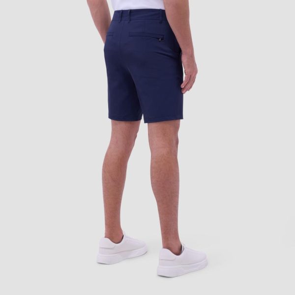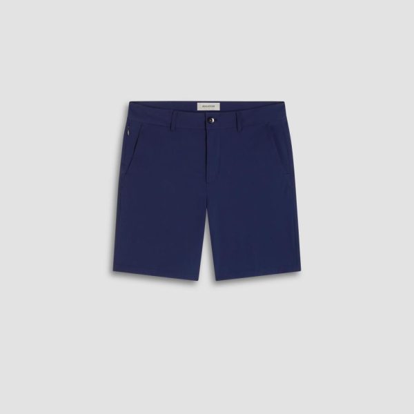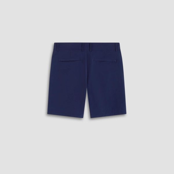Bermuda shorts in performance fabric feature a tailored looped waistband with a zipper and button fly, two slanted side pockets, one zippered seam pocket, and two back pockets with covered zippers. Ideal for casual wear, active wear, or golf, these shorts combine style and functionality for any occasion.