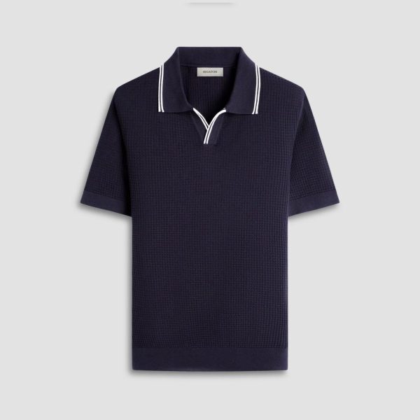 This stylish seed rib Johnny collar sweater features short sleeves and is crafted from a comfortable cotton blend, elevated by solid flat rib collar, cuffs, and waist with contrasting tipping detail. The textured seed rib pattern adds depth and visual interest, making it a classic versatile piece perfect for layering or wearing on its own.