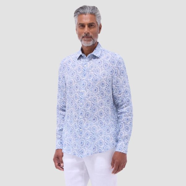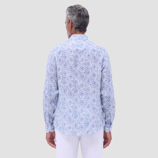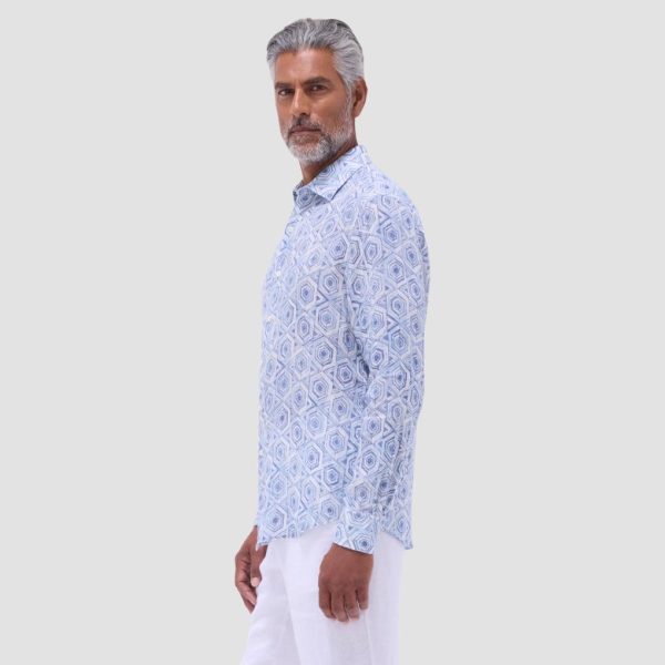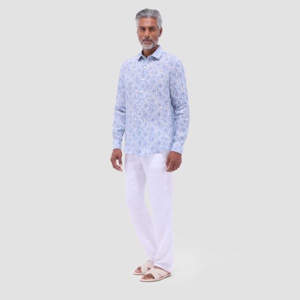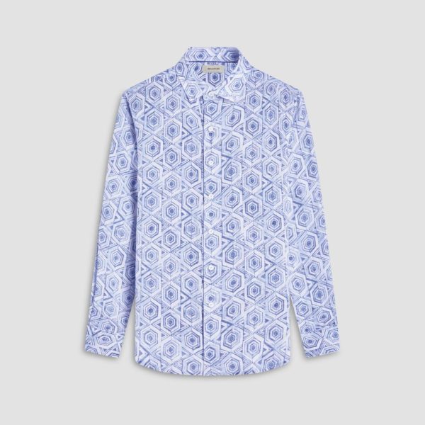 The Julian long-sleeve shirt in geometric print is crafted from 100% Italian linen fabric. It features a point collar, a curved hem that can be worn tucked or untucked, mother-of-pearl buttons, and notched cuffs adjustable for a custom fit-wear them snug or loose. The natural texture of linen adds a laid-back, effortless charm to any outfit.