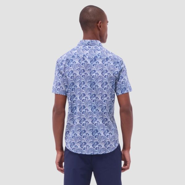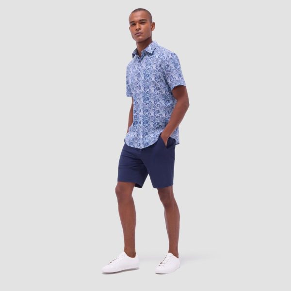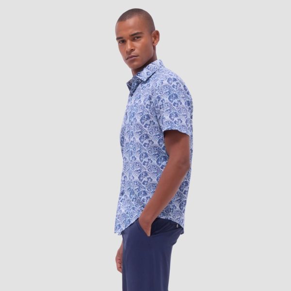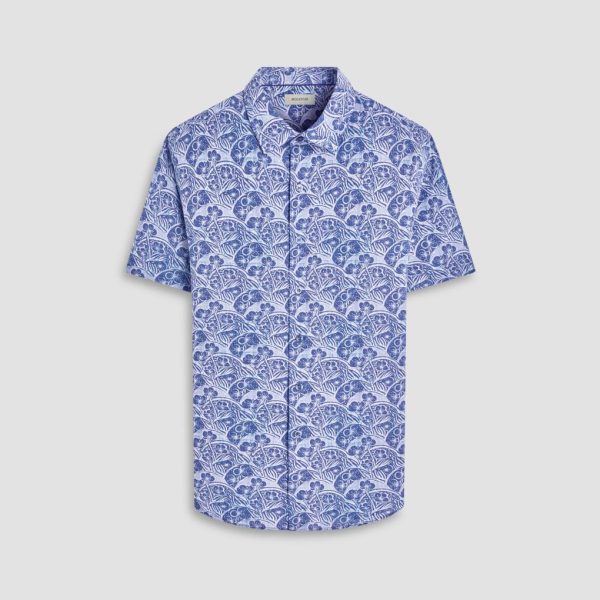 The Orson short-sleeve shirt in floral print is crafted from a lightweight, airy blend of cotton and linen. It features a point collar, mother-of-pearl buttons and a curved hem that can be worn tucked or untucked, making it the perfect choice for both casual and semi-formal occasions.