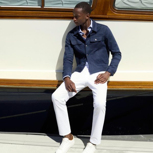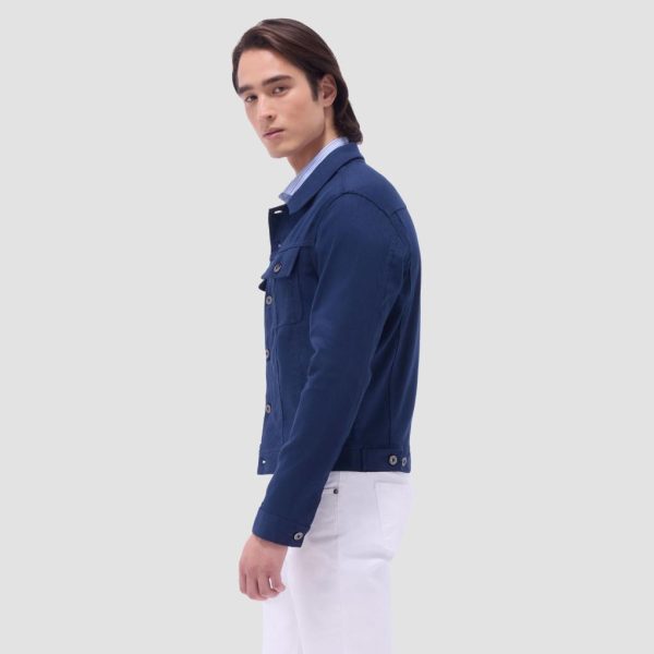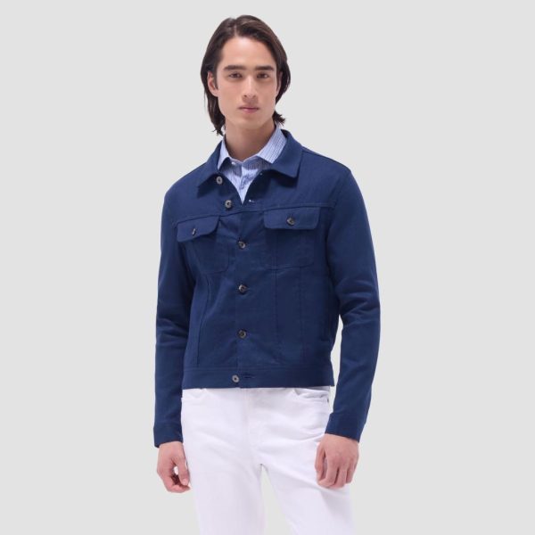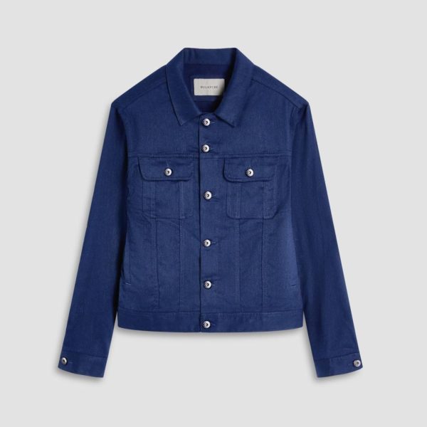 Trucker jacket crafted from a premium linen-cotton blend with added stretch, combines comfort with timeless style. It features all-over metal buttons with shanks, a point collar, two chest patch pockets with flaps and buttons, two vertical side pockets, and a tailored waist with buttons for a flattering fit. Perfect for layering or wearing on its own, it’s a practical addition to any wardrobe.