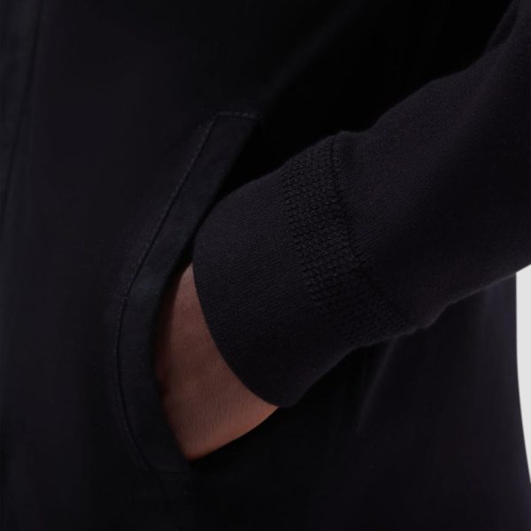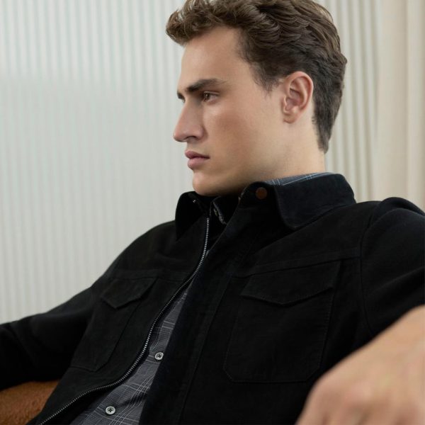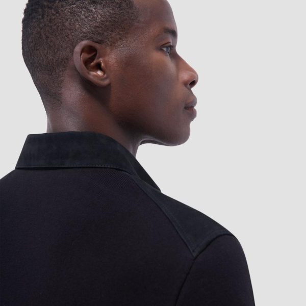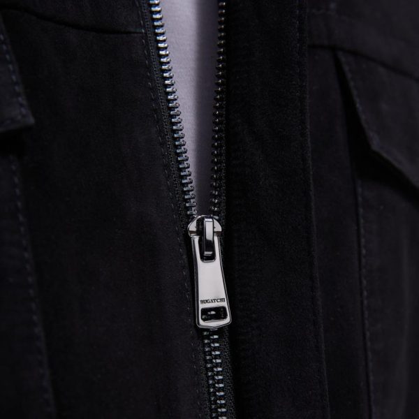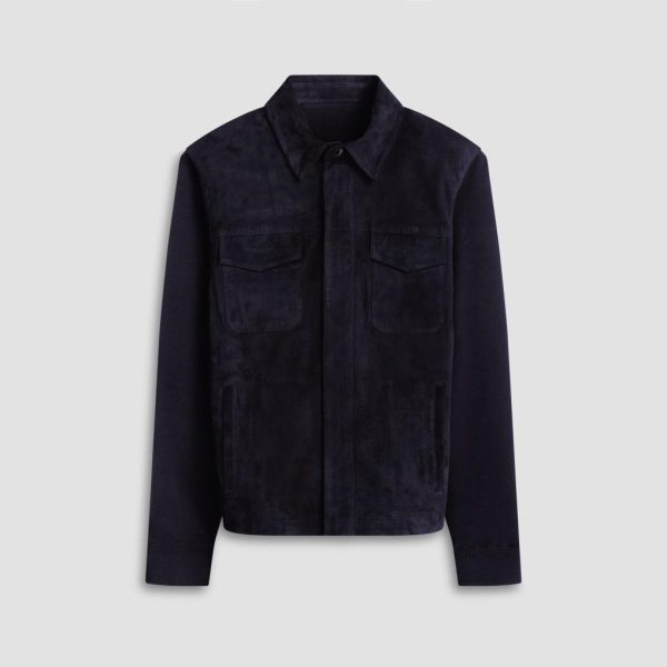 A hybrid bomber jacket that merges luxe materials with smart design, crafted from 100% goat suede on the front and 100% cotton sweater-knit sleeves and back. Fully lined, it also features a point collar and two-way zipper with covered placket. Two chest flap pockets with snaps, two vertical snap pockets, and an inside suede patch pocket with embossed logo add functionality and style, making this jacket a refined choice for any wardrobe.