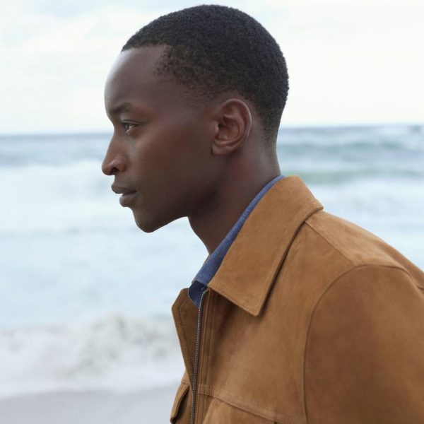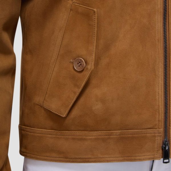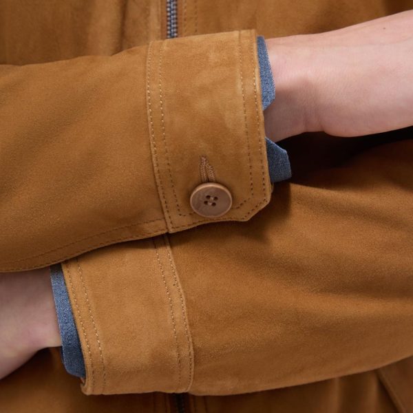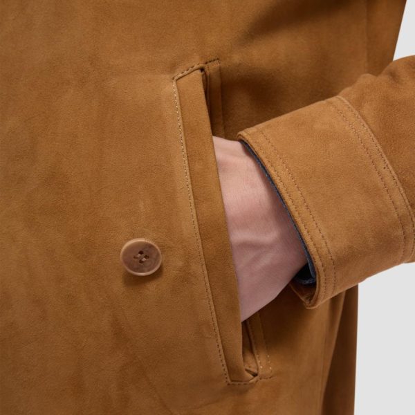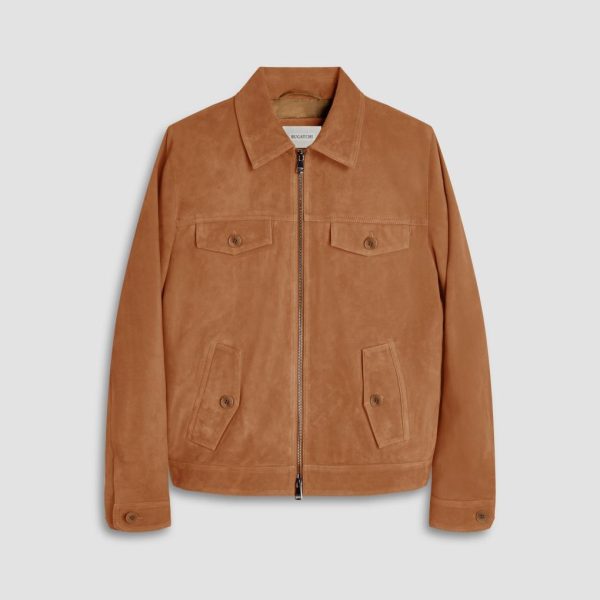Trucker jacket in 100% goat suede fully lined for comfort, features a classic point collar and a two-way zipper for versatile wear. Corozo buttons accent the cuffs and four flap pockets, adding a touch of natural elegance to this timeless design. Inside, a suede pocket with an embossed logo brings an extra element of luxury. This jacket effortlessly blends rugged style with refined details for a versatile look.